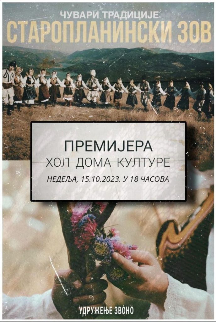 Kompozicija i spot Staroplaninski zov, koja je snimljena u okviru projekta Zov tradicije koji udruženje Zvono Pirot i grupa Čuvari tradicije realizuje u okviru Javnog konkursa u oblasti kulture grada Pirota, biće predstavljena u nedelju 15. oktobra u 18h u Holu Doma kulture Pirot. Kompozicija Staroplaninski zov je delo autora Dušana Antića, koji je na Saboru frulaša Srbije osvojio prvu nagradu. Spot za ovu kompoziciju snimljen je u selu Pokrevenik.